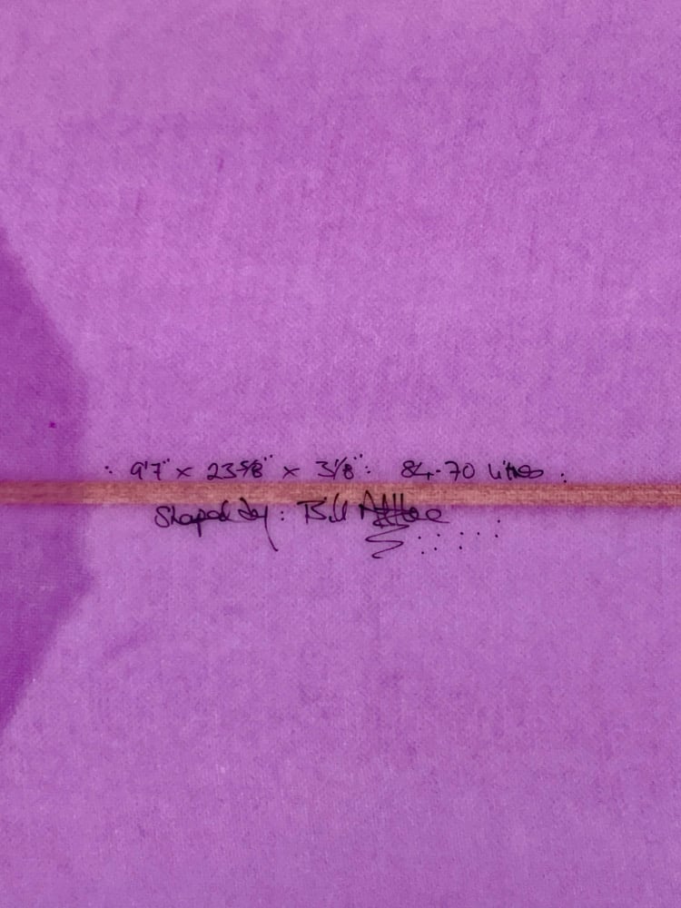 This example 9’7” x 23 5/8” x 3 1/8” x 15 ¾” tail x 19 3/8” nose x 84.70 litres volume